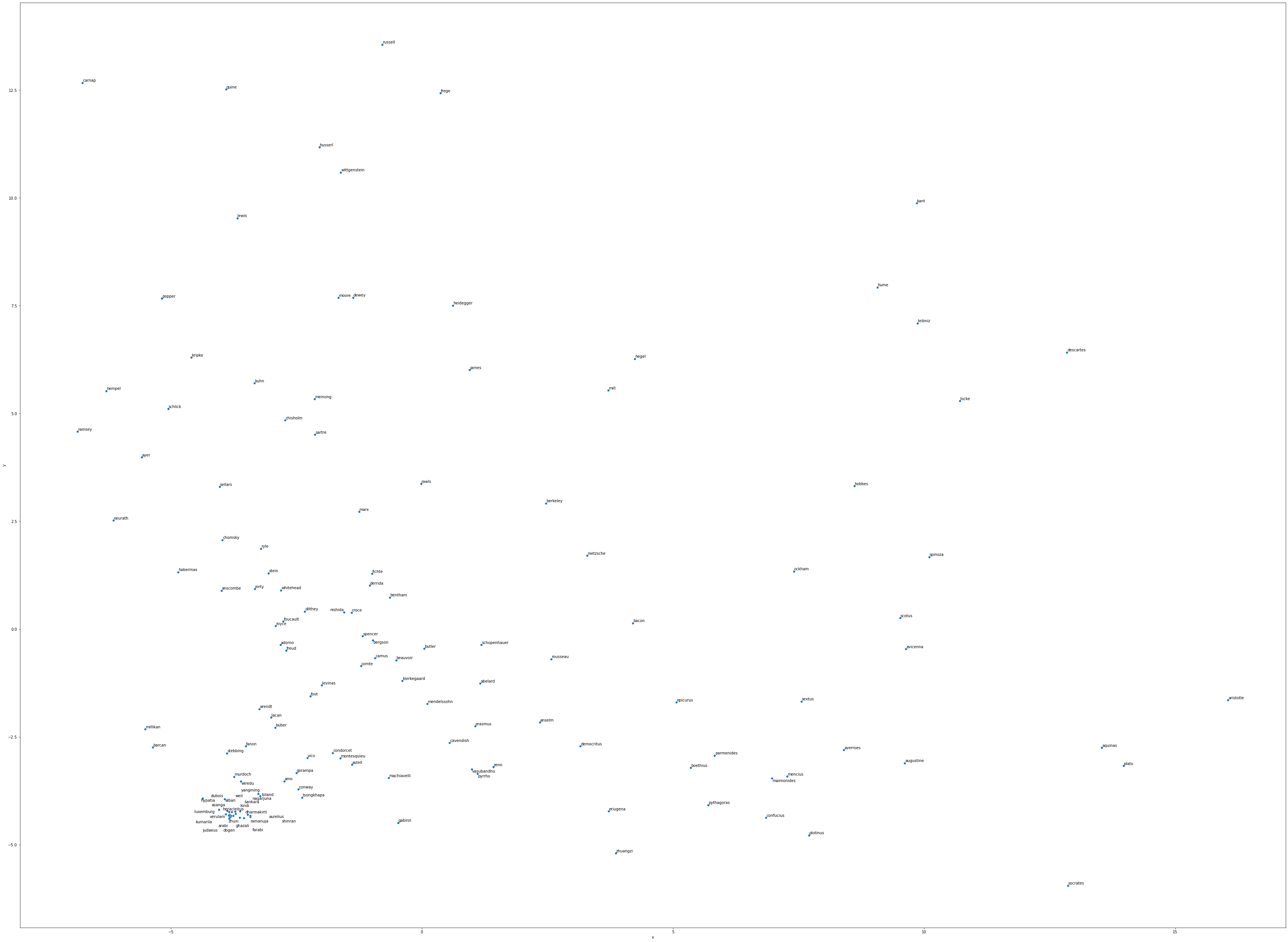 This may appear chaotic at first, but the closer you examine, the more patterns start to emerge. The ‘big three’ Ancient Greeks are lumped together, as are early modern European philosophers, and some kind of analytic-continental divide seems to have been noted. The biggest question is why most philosophers clump around the bottom left. The answer I suspect (and this is guesswork on my part) is that they are underrepresented in the dataset. I will discuss this more below because it highlights something very important about these representations.