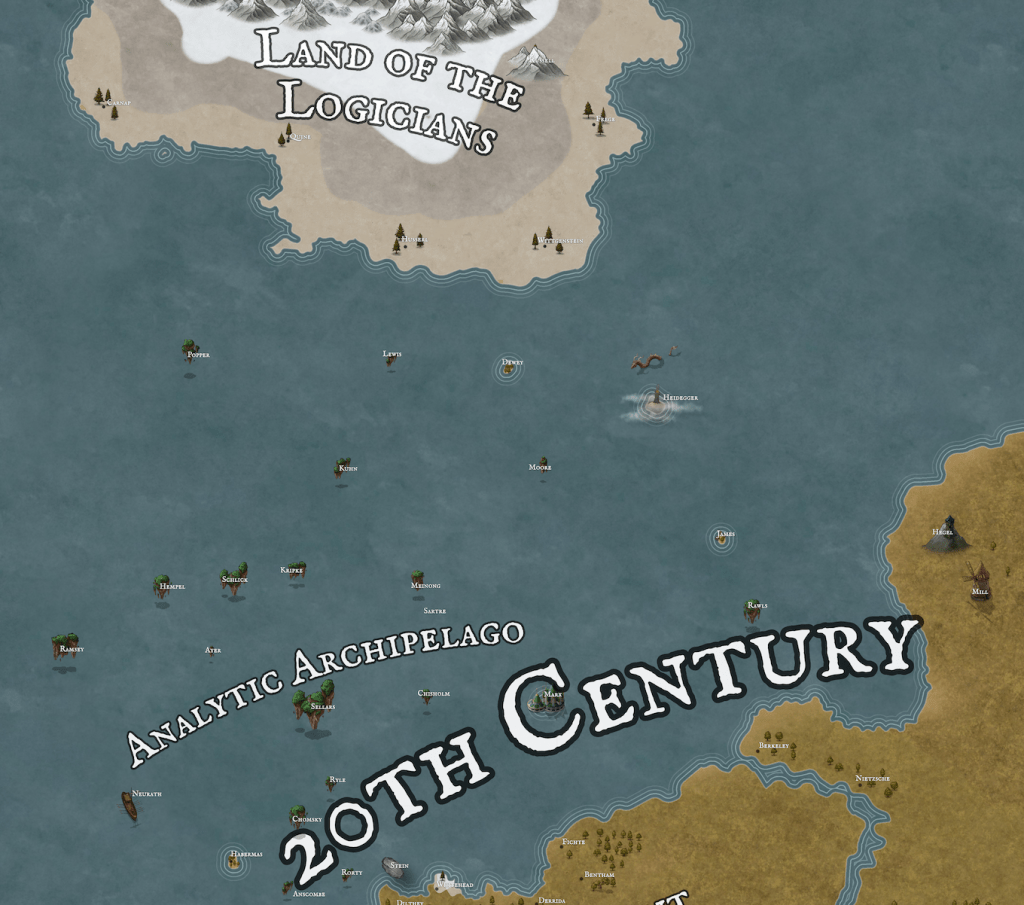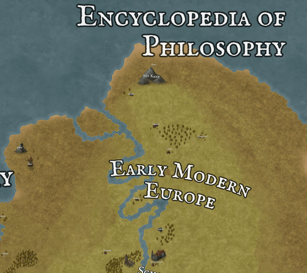 I’ll be honest, the main reason I chose to represent this as a fantasy map was because I thought it would be fun, but I don’t think the form is inappropriate. Few genres reflect biases more clearly than fantasy. And maps, it’s worth remembering, reflect our knowledge of the world, not the world itself (for more thoughts on ‘knowledge-first’ cartography see here). This isn’t a map of the history of philosophy or of the space of logical possibilities. It is a map of an encyclopaedia of philosophy that reflects the interests and values of the community who compiled it. Filtering this through a neural network has made things less, not more reflective of reality. The space itself is not euclidean but bent and distorted by the algorithm. Some people are treated as similar because their work shares common themes; others are treated as similar because their work is less well-known. The network knows only signs (and maybe less than that).