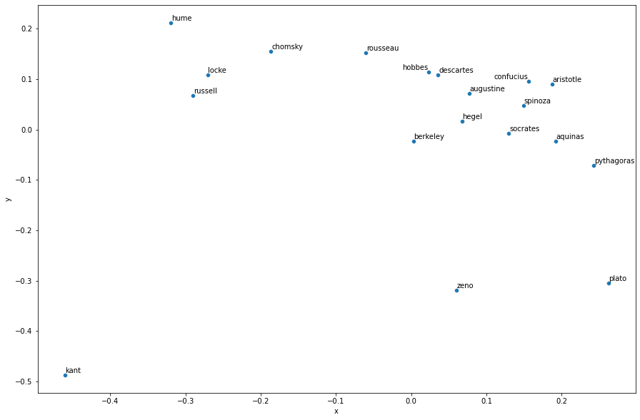 The glamorously named ‘fasttext-wiki-news-subwords-300’ is one of the most impressive pre-trained sets of word vectors. It was trained on Wikipedia in 2017 and contains 1 million word vectors taken from a corpus of 16 billion tokens.* When fed a list of philosophers, it gives us this: