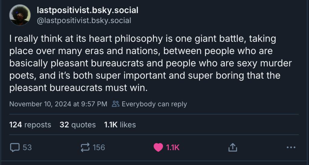 Of course, the analytic-continental distinction isn’t always the best way to understand 20th century philosophy (and it has largely been redundant since 01/05/2019) and recent work has found it more hermeneutically fecund to categorize a philosopher as either a ‘sexy murder-poet’ or ‘basically pleasant bureaucrat’. Since neither of these terms are yet attested in the Stanford Encyclopedia, I have had to settle with a simple poet-bureaucrat axis. I was surprised at how well it tracks some intuitions and I am curious about where it diverges. At the top, we have the most poet-like philosophers (Sartre, Heidegger, Nietzsche) and at the bottom, we have the most bureaucrat-like philosophers (Hempel, Lewis, Kripke). Sartre may have disliked poets, but his language is undeniably poetic while both Heidegger and Nietzsche explicitly wrote poetry. Hempel, meanwhile, has big bureaucrat vibes. Here are the results (with poet at the top and bureaucrat at the bottom).* Feel free to comment with suggestions for other names you would like to see examined. I used my 20th century philosophy list because I had it to hand but obviously I should generalize this to all the philosophers who showed up on my map of the Stanford Encyclopedia.